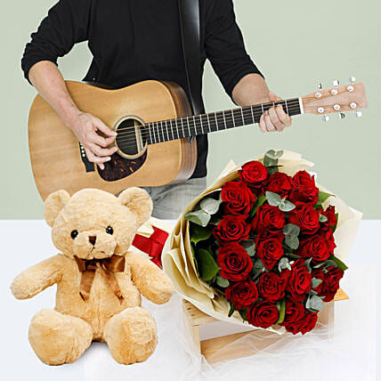 • An enchanting bouquet of red roses, combined with melodious tunes and an adorable teddy bear, this gift perfectly expresses “I care for you.” Tell someone that you care for them without using any words. Our professional guitarist will play the songs of your choice for 15 minutes, and we will try our best to help you make your special moments more memorable.
