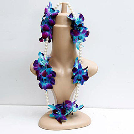 Nothing would complement your beloved's look and style than this beautiful neckpiece accessorized with blue orchids and pearl strings. It is sure to lay greatest impact when beautifully presented.