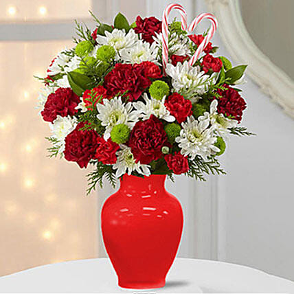 Flowers symbolize hope, joy, peace, beauty, and strength. Since times immemorial, flowers have been adopted as a great gift option for anyone and everyone. Here is a thrilling vase arrangement of red carnations, white chrysanthemums, and green chrysanthemums which would enhance the beauty of the space wherever it is kept.