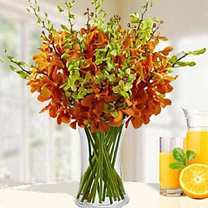 This bright glass vase arrangement of orange and green mokara orchid is a symbol of joy, warmth, creativity, success, determination, excitement, and freedom. The combination of orange and green is creating an atmosphere of love and faith. A perfect gift that can be kept on the center-table, this floral arrangement is definitely going to be loved by your near and dear ones.