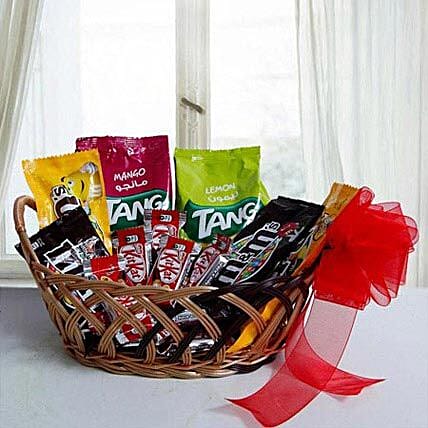 She will feel extra special when she receives this enchanting gift full of sweet and savory treats. An oval shaped cane basket embellished with red ribbon bow overflowing with lemon and mango tang, packets of peanut, chocolates and kitkat makes an ideal gift to delight her in any occasion.