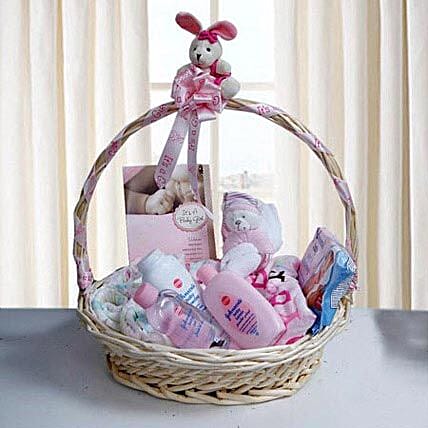 Handle shape basket arrangement with 1 pink baby blanket, 1 it’s a girl greeting card, 6 baby diapers , 1 pink teddy rattle ,1 baby powder, 1 pack of baby wipes , I baby oil , 1 baby lotion decorated with it’s a girl ribbon and 1 small 2" soft toy