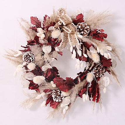 • A Wreath represents the unending circle of life, which symbolises growth and everlasting life. Here is a beautiful wreath you can hang on your door, and welcome your guests with the spirit of the holiday. This dry flower wreath consists of Maple Leaves, Pine Cones, Nularia, Pompous, Phalaris Phoa, Cardus Bleached and Natural Jute Ribbon.