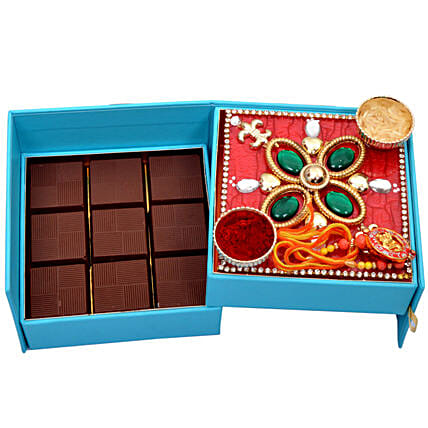 9pcs assorted chocolates, with vermilion, rice and Rakhi bracelet