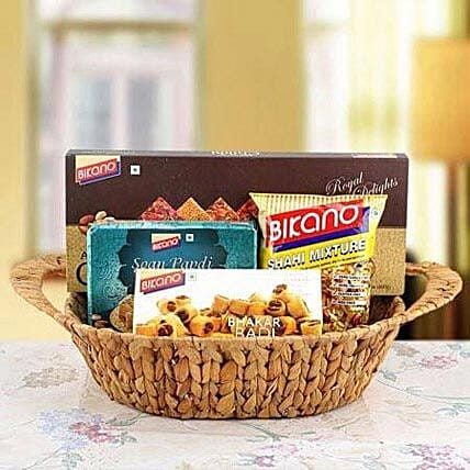 Bring happiness and joy to your loved ones by surprising them with this lovely combo of sweet and salty in one wooden basket. This hat shaped wooden basket carries the soan papdi, chikki, and other salty snacks. Enjoy the moment at home with your friends and relatives on some happy occasion placing this basket right at the centre.