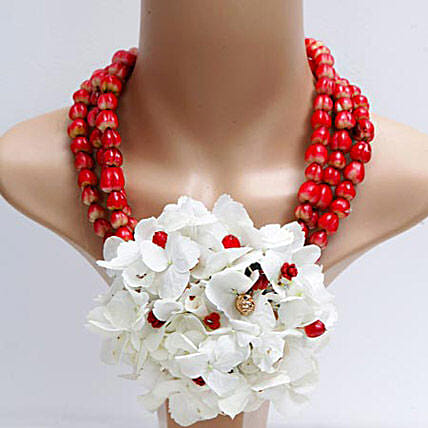 This simply yet stunning neckpiece with white hydrengia and red african berries makes a delightful accessory. Worn as a necklace corsage, this is an elegant way to add a dash of natural glamour to her exclusive outfit.