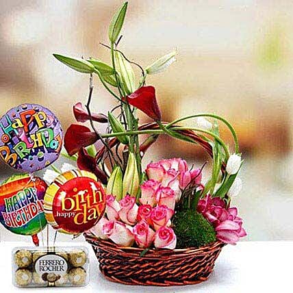 Looking for a perfect surprise? Shop for our basket arrangement with colorful Roses, Lilies, Tulips and Moss Ball to win a smile on the birthday celebrant's face. Make them feel special with Ferrero Rocher and Birthday Balloons.