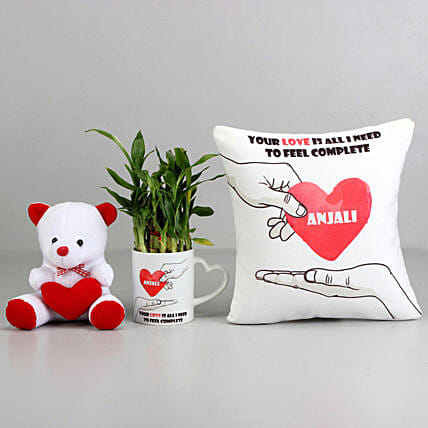 • Love can be best expressed by gifting this cute personalised cushion, lucky bamboo and teddy combo to your partner on upcoming Valentine's Day.