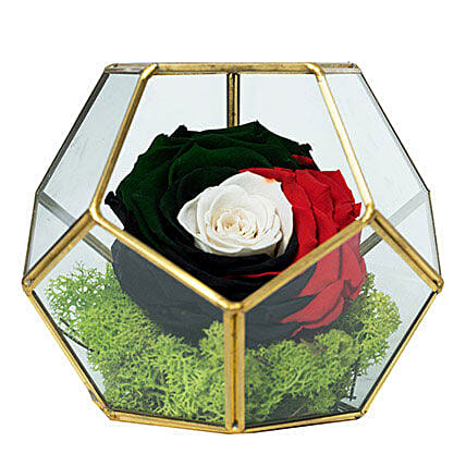 • UAE Flag Color Preserved Rose in a Premium Golden Color Pot.