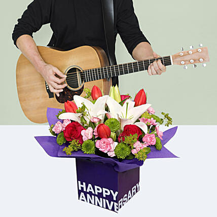 • Just when she thinks that you forgot your anniversary, surprise her with beautiful melodies played by our professional guitarist. Let her know that you would never forget the most beautiful day of your life. The melodious tunes are accompanied by a beautiful flower arrangement for her. The guitarist will play songs of your choice for 15 minutes.