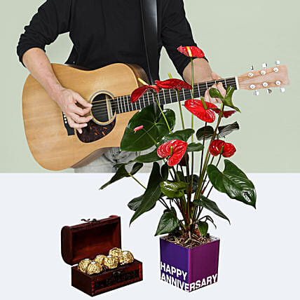 • Just when she thinks that you forgot your anniversary, surprise her with beautiful melodies played by our professional guitarist. Let her know that you would never forget the most beautiful day of your life. The melodious tunes are accompanied by an exotic red anthurium plant for her. The guitarist will play songs of your choice for 15 minutes.