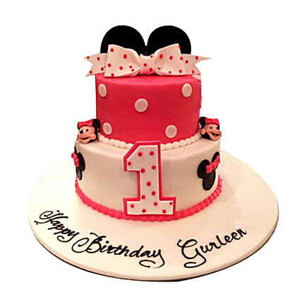 A two tier designer fondant cake is ready here to greet your baby on her birthday. This is a Minnie Mouse special cake with inclusion of the perfect elements from the looks and style of a Minnie Mouse. The polka dots on pink and the cute bow are providing extra sweetness to the cake.