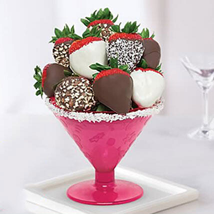 Celebrate the Saturday night fever in an amazing manner with the help of this luscious fruit arrangement. It consists of mouth-watering semi-sweet chocolate dipped strawberries with a variety of tempting toppings that are presented in a martini glass-shaped container which is reusable. The colour may vary from the shown image.