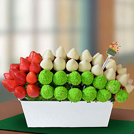 • This National Day, you can gift this beautiful and tasty arrangement of strawberries. For this purpose the fresh strawberries are first dipped in dark and white chocolates and then tinted with green and white chocolate along with desiccated coconut. Let your loved ones enjoy this unique, crunchy, and delicious strawberries.