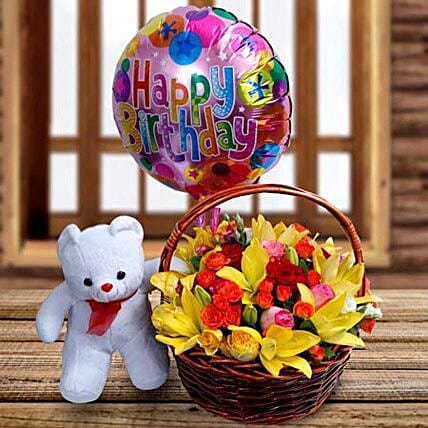 Innocent and pure love is portrayed through this adorable basket arrangement comprising of red, pink and yellow roses, orange spray roses and yellow asiatic lilies. Paired with a Happy Birthday Balloon and white teddy bear, this gift exudes a soft and feminine look.