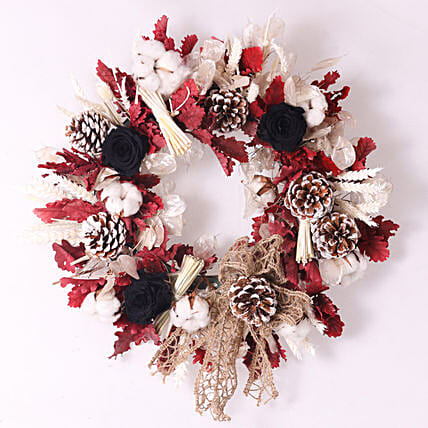 • Decorate your house with the best. Here is a beautiful wreath made of 3 Preserved Black Roses, Maple Leaves, Cotton Stick, Lunaria, Tarwe Bleached and Pine Cones along with Natural jute Ribbon. The round shape of wreaths represents growth and everlasting life. Hang it on your door, and enhance your Christmas décor, while welcoming your guests with holiday cheer.