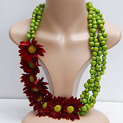This long neckpiece with green berries and red chrysanthemums is a gorgeous accent piece for lovely lady. With distinguished look, it is sure to create wonderful complement to the style.
