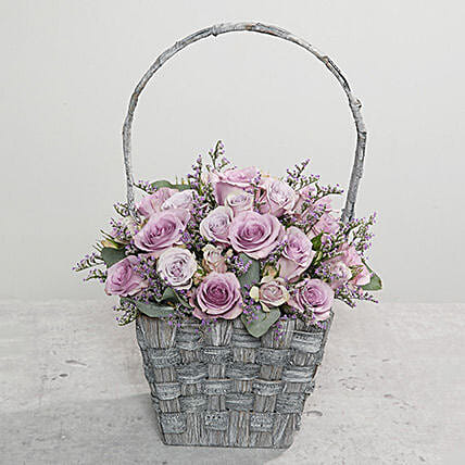 Purple Flowers In Rustic Handle Basket
