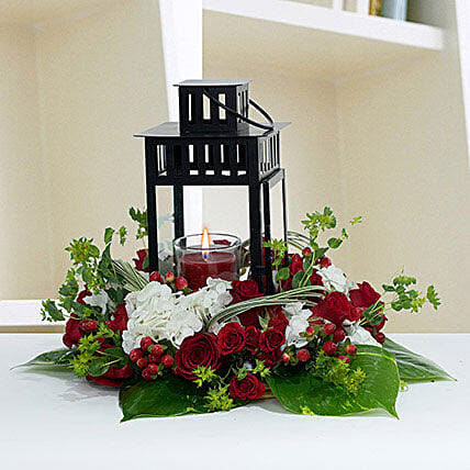 This pleasant center table flower arrangement with the black lantern and a red candle is perfect for an evening party decoration. Light this candle and let positive energy flow in the whole house. You can also give it to your near and dear ones on their special occasions.