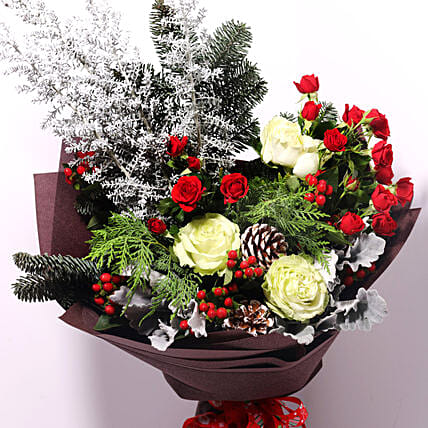 • Decorated with Pine cone and Ribbon in a Brown Wrapping