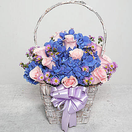 Roses and Hydrangea in Purple Bakset