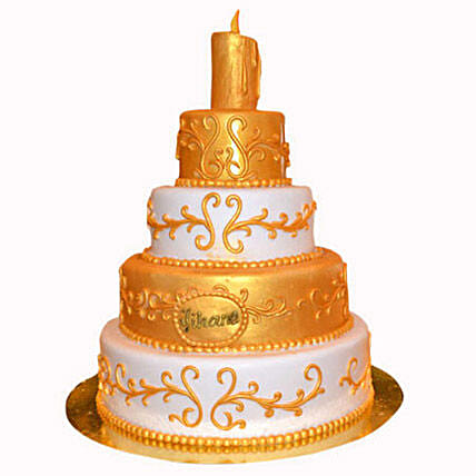 You must bring forth a fondant wedding cake like the one depicted here. The shimmering golden colour is adding that extra zing factor to this glorious moment when two souls are coming together for eternity. So, embellish the grand wedding day with such a beautiful cake to be remembered forever.