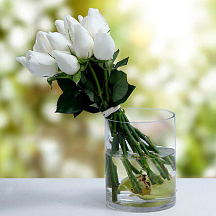 Planning to make the occasion a heavenly affair for someone whom you know? Then, this premium white rose bouquet in a glass vase makes a worthwhile gift. These white roses are an ideal floral arrangement and are a perfect idea to be gifted to your lady love to express your heart felt emotions in a wonderful way.