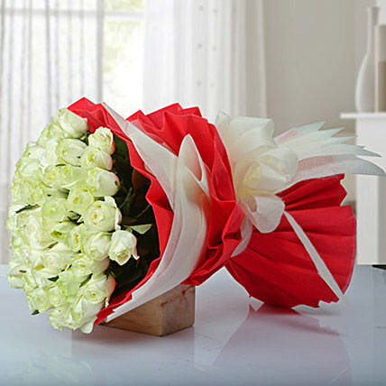 Get this timeless beauty of white roses to get melted in the lives of your dear ones. From Ferns N Petals you can get this bunch of fresh white roses that is expertly wrapped with red and white papers and with white ribbon.