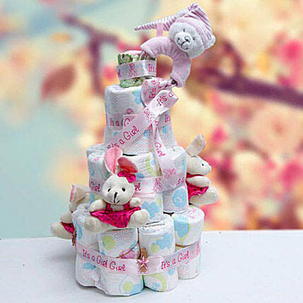 Amaze new parents in your life by sending them this beautiful fun and functional diaper cake with its a girl accessories. The new parents are sure to get delighted with the usefulness of this charming little pal diaper cake. Carefully fashioned in the shape of cake, every single diaper is ready to use the moment when required.