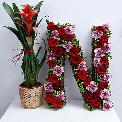For an exotic gift, you don't need to hunt all the way. This N- shaped arrangement of Red Roses, Purple Carnations with Green berries and moss makes a stunning gift. This spectacular floral arrangement is sure to leave a major impact on your dear ones. Paired with Guzmania plant with lovely bromeliad having Green leaf Rosette has Red and White tips at its center. Overall, this makes a perfect potted plant gift for your loved ones.